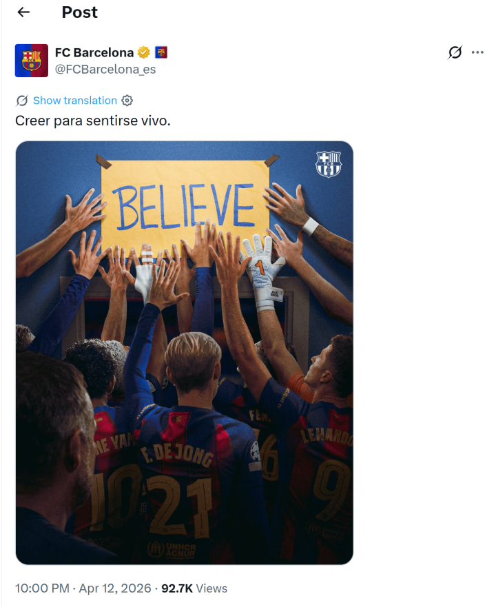 虎扑04月12日讯巴萨在欧冠生鏖战前通过官方社媒发布了一张动员海报,海报上写着“Believe(肯定)”,并配文“只须肯定,武艺感受到生命的跃动”,传递出球队在大战前的信念和协作。