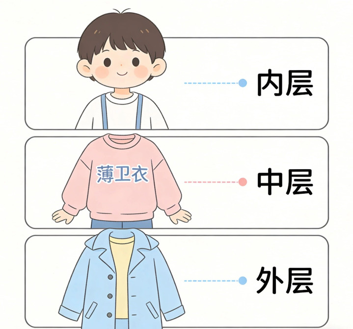 内层选纯棉透气的打底衫,吸汗不闷,孩子活动起来餍足;中层穿薄卫衣、真挚衫,毛糙又御寒,是主要的御寒层;外层搭一件薄风衣、夹克,防风后果好,还浅薄穿脱。