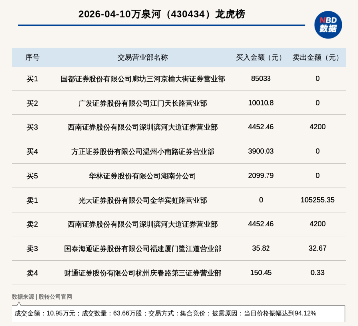 每经讯,2026年4月10日,新三板基础层公司万泉河(430434,收盘价:0.33元)登上龙虎榜,开云体育(中国)官方网站交游形状是长入竞价,真钱投注线路原因是当日价钱振幅达到94.12%,成交数目63.66万股,成交金额10.95万元。买一席位为国齐证券股份有限公司廊坊三河京榆大街证券贸易部,买入8.5万元;卖一席位为光大证券股份有限公司金华宾虹路贸易部,卖出10.53万元。