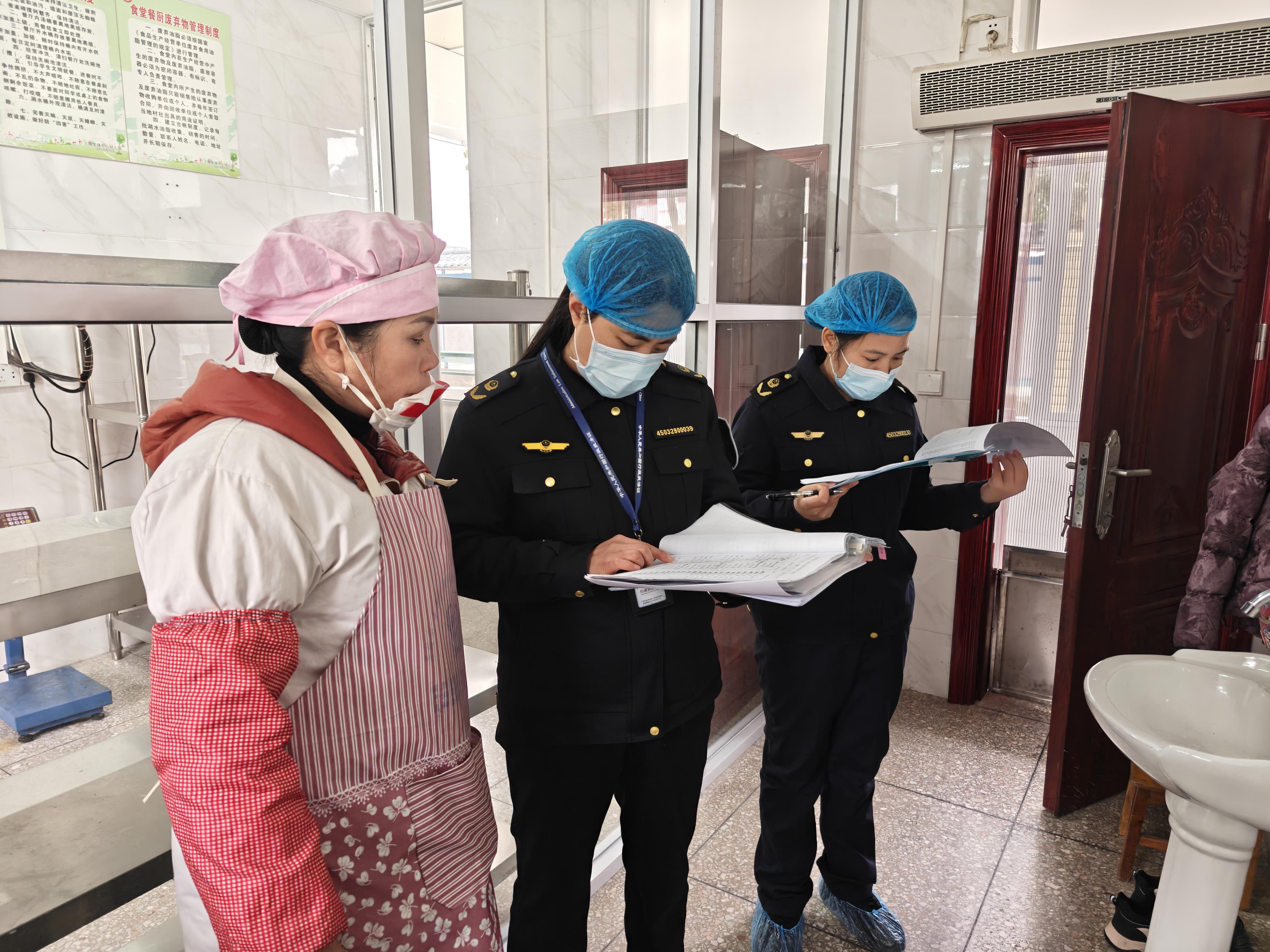 规矩东说念主员观测学校食堂食材购进台账。龙胜县阛阓监管局供图
