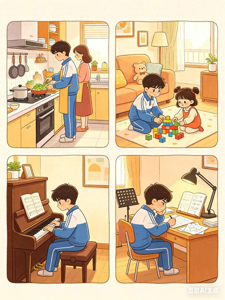 小杰目下月朔,收货不是顶尖,但他会帮姆妈作念饭,会矜恤表妹,会坚执练琴,会为了一个障碍探究半小时。眷属里的东说念主齐夸他“巩固”“靠谱”“有潜力”。