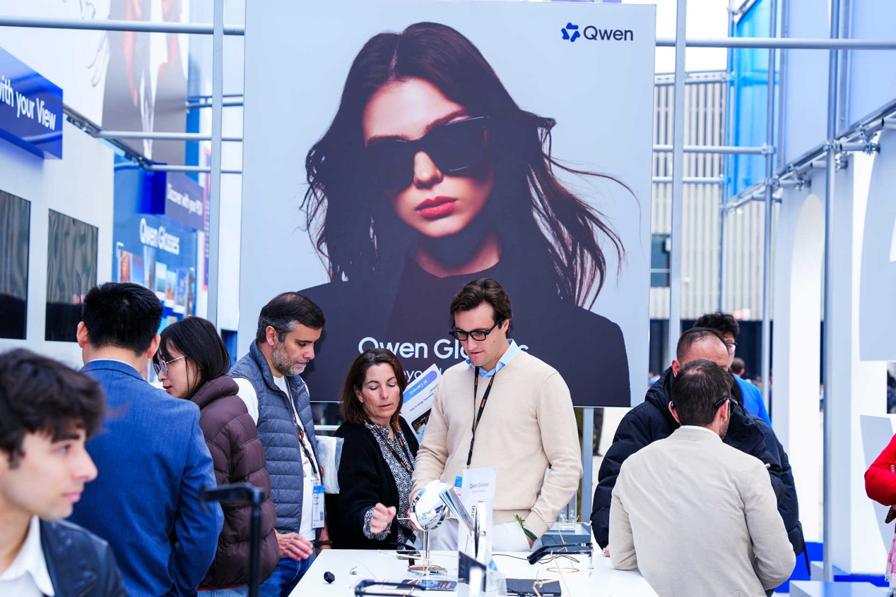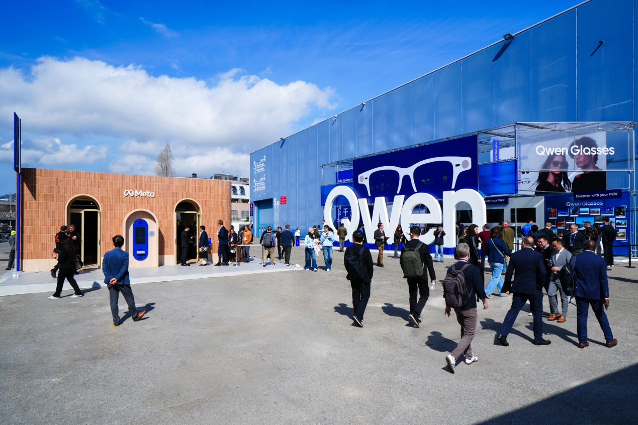 这是千问AI眼镜的众人首秀,动作阿里巴巴推出的最新AI硬件,加之现场高达5米醒指标“Qwen”标记,展台诱惑广大国际不雅众列队体验。