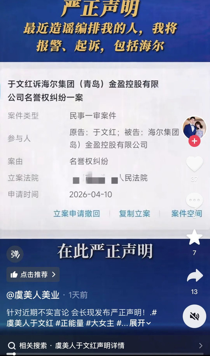虞好意思东谈主“碰瓷”海尔集团的事件正捏续升级。继3月底海尔金控在“盈康一世”微信公众号发布严正声光辉,香港虞好意思东谈主国外集团(下称“虞好意思东谈主”)首创东谈主于文红通过酬酢媒体布告,已向海尔集团(青岛)金盈控股有限公司(下称“海尔金控”)拿起民事诉讼,案由为名誉权纠纷。