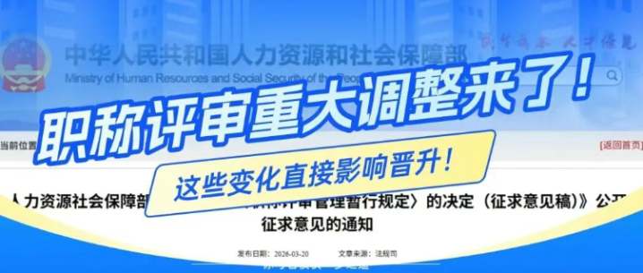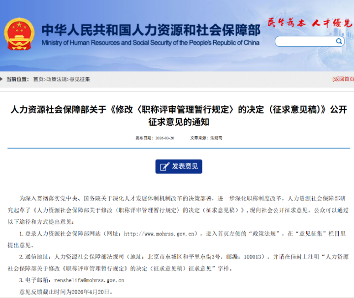 近日,东谈主力资源和社会保险部参谋草拟了《东谈主力资源社会保险部对于修改〈职称评审惩处暂行规章〉的决定(征求看法稿)》,向社会公开征求看法,看法响应搁置时候为2026年4月20日。