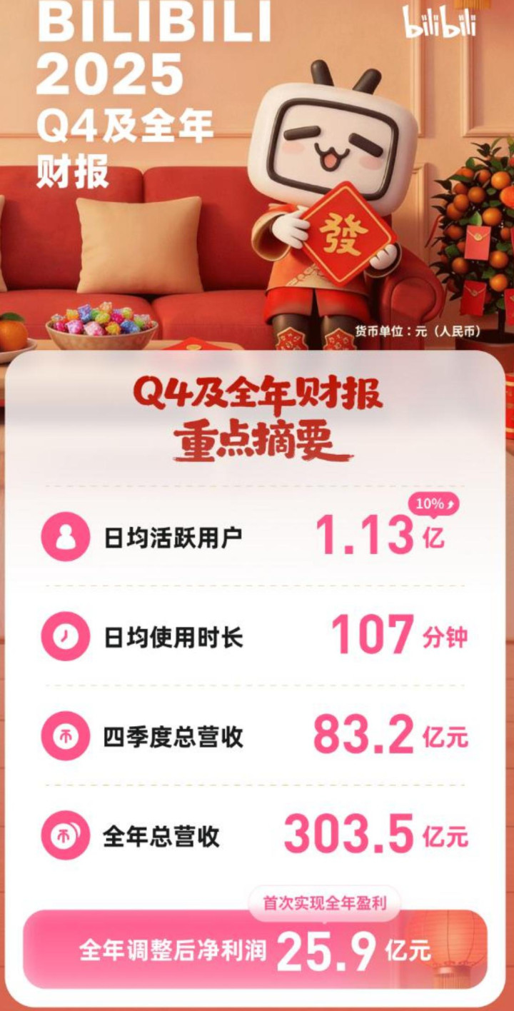 3月5日晚,真钱投注平台B站交出2025年收获单:全年营收 303.5亿元,同比增13%;净利润 11.9亿元,一举扭亏(上年同时净亏13.6亿元)。董事长陈睿在财报会上直言, “B站初次兑现全年好意思国公认管帐准则下的盈利”,号称“具有里程碑兴致”。