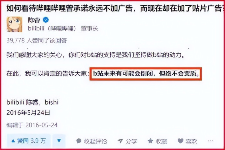 2016年,B站董事长陈睿曾许下“B站异日有可能会倒闭,但毫不会变质”的快乐,这句话早已成为老用户心中的信仰条约。