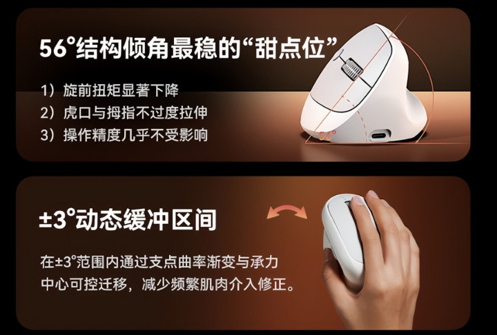 ▶幸免叠加劳损,详实症状加剧:它优化了点击、挪动的发力面孔,减少手腕不消要的扭转和摩擦,裁减叠加性劳损风险;同期贴抓部弧线的筹划,让操作更省力,对已有鼠标手症状的东说念主群,能灵验幸免不适加剧,接济迟滞还原。