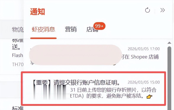 值得缓和的是,这次封店并非毫无预兆。早在2026年3月5日,Shopee泰国站卖家就已收到平台官方示知,条目在3月31日前上传银行存折相片以完成银行账户信息核验。