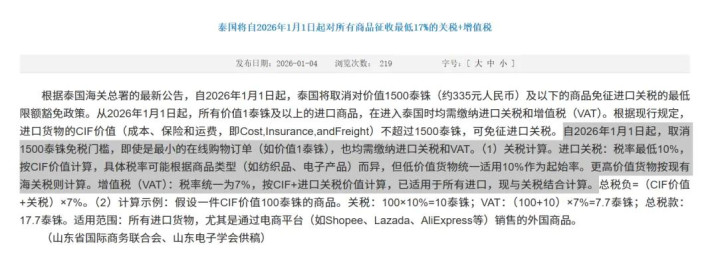 自2026年以来,泰国针对跨境电商的监管力度泄露升级。除了上述账户信息核验条目外,泰国海关已自2026年1月1日起取消价值1500泰铢以下商品的入口免税计谋,对总计价值1泰铢及以上的入口商品结伴征收入口关税和7%升值税。